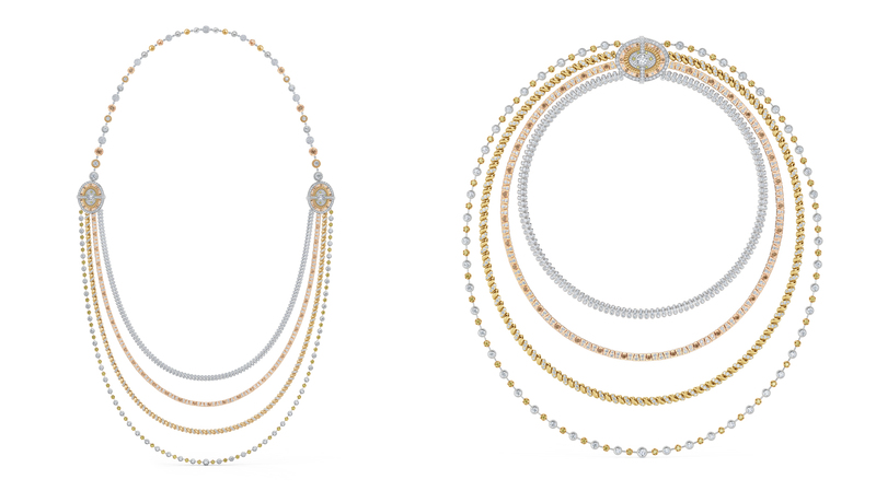 A long, transformable necklace has four diamond strands—one representing each season, De Beers said—strung between two removable clasps. The necklace can be shortened and worn with one clasp for an entirely different style.