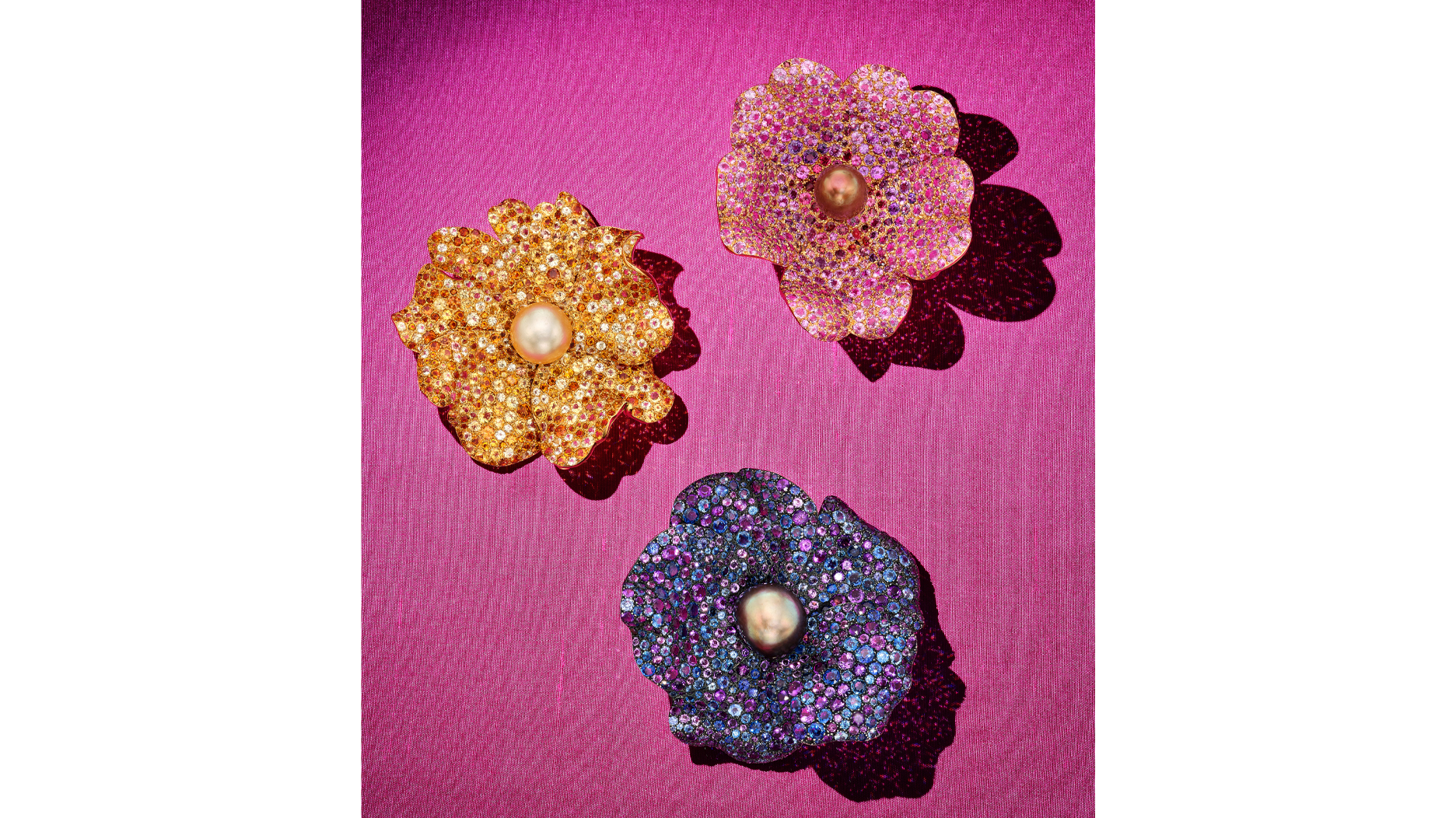 His three “Wild Rose” brooches on offer, estimated to achieve up to $1.2 million total, are designed as blooms set with colored stones centered by natural pearls.
