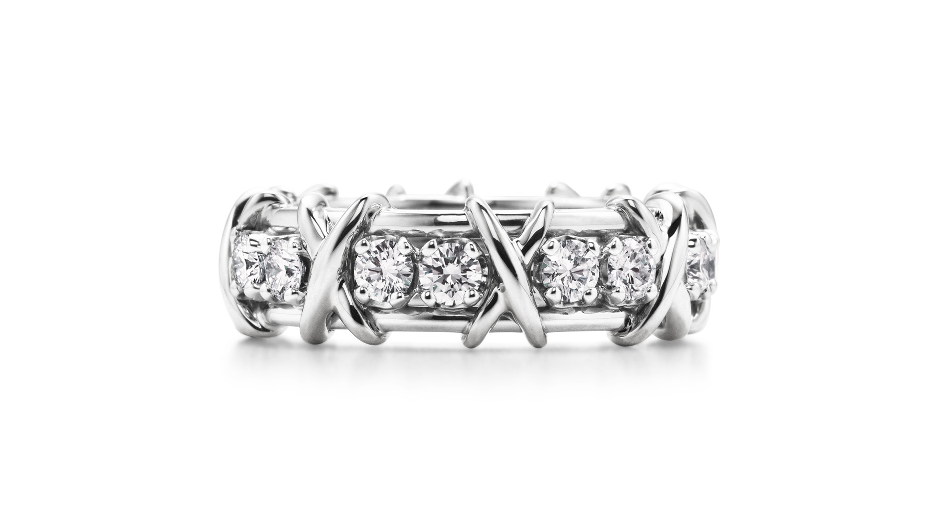 On her middle finger was a “Sixteen Stone” ring designed by Jean Schlumberger for Tiffany & Co. in 1959 to express love’s nurturing forces. It showcases 1.14 carats of round brilliant-cut diamonds interspersed with platinum Xs.