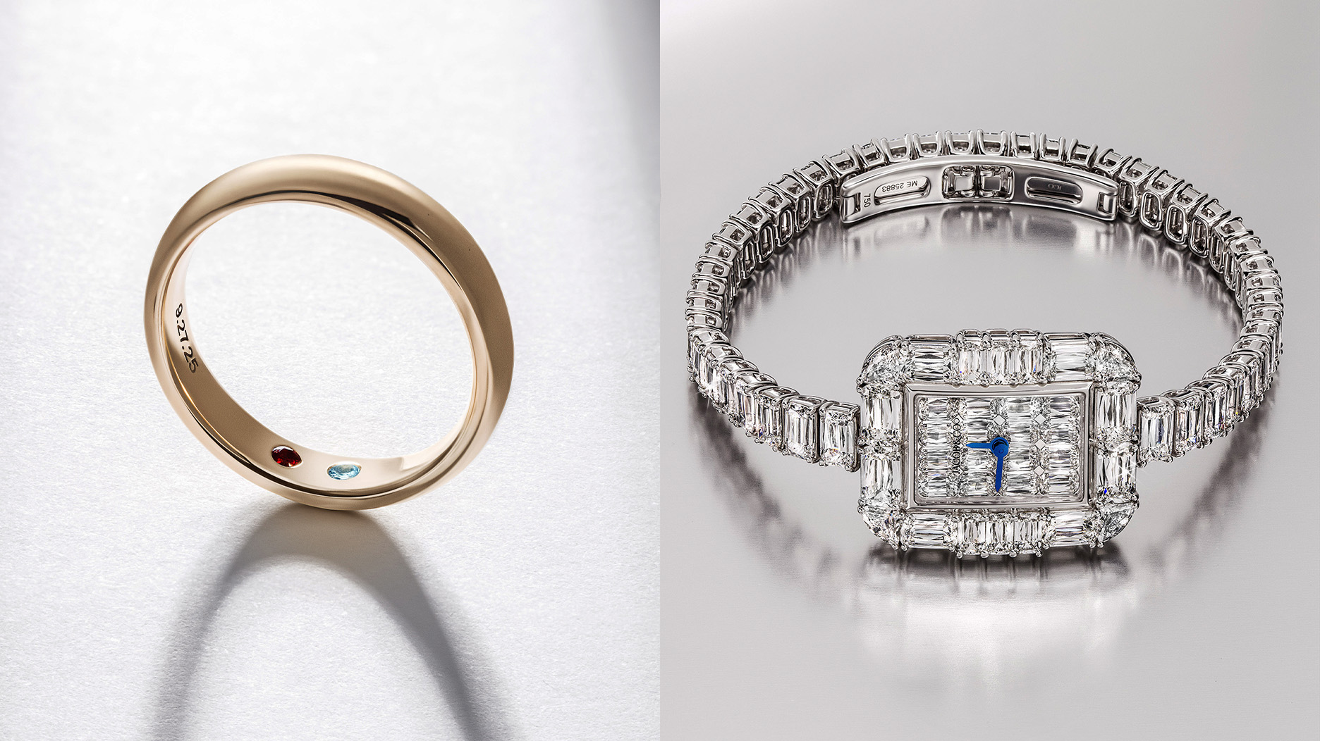 However, two gemstones are hidden inside—a 0.03-carat round-cut pavé ruby and a 0.03-carat round-cut pavé aquamarine, the couple’s birthstones—as well as an engraving of the couple’s wedding date.