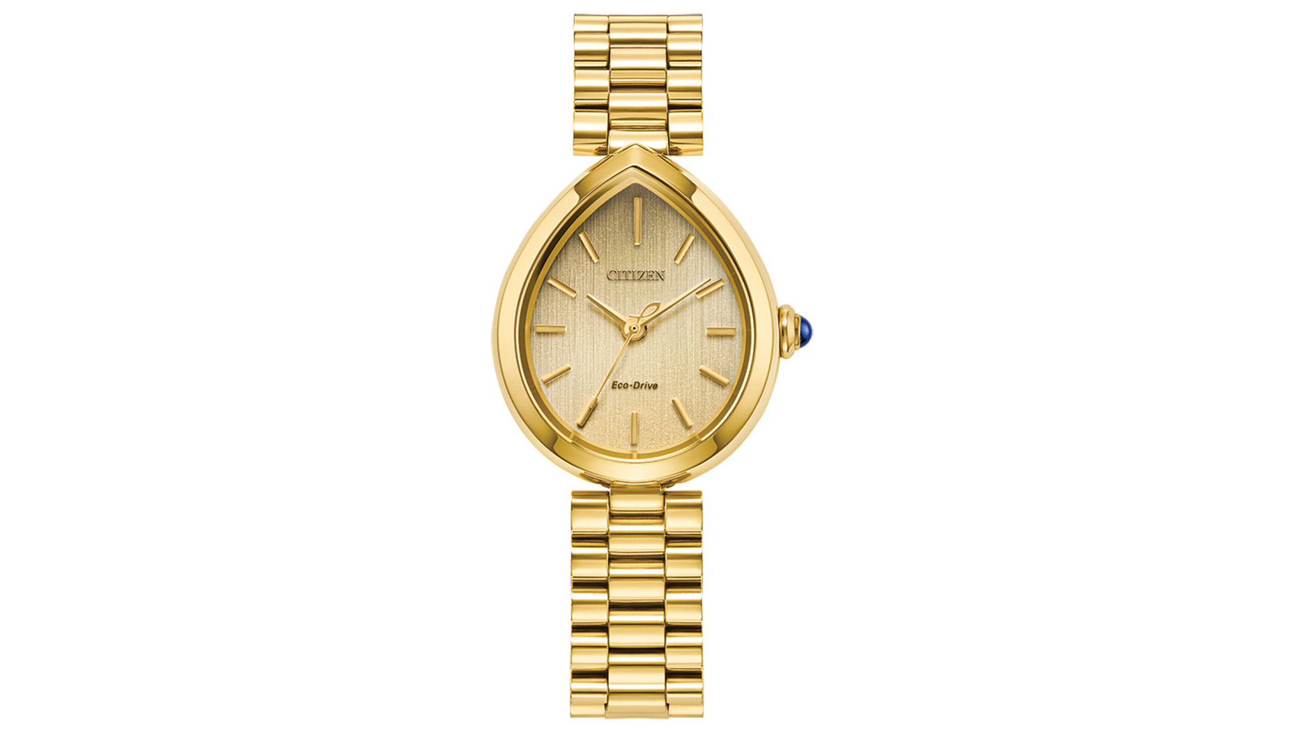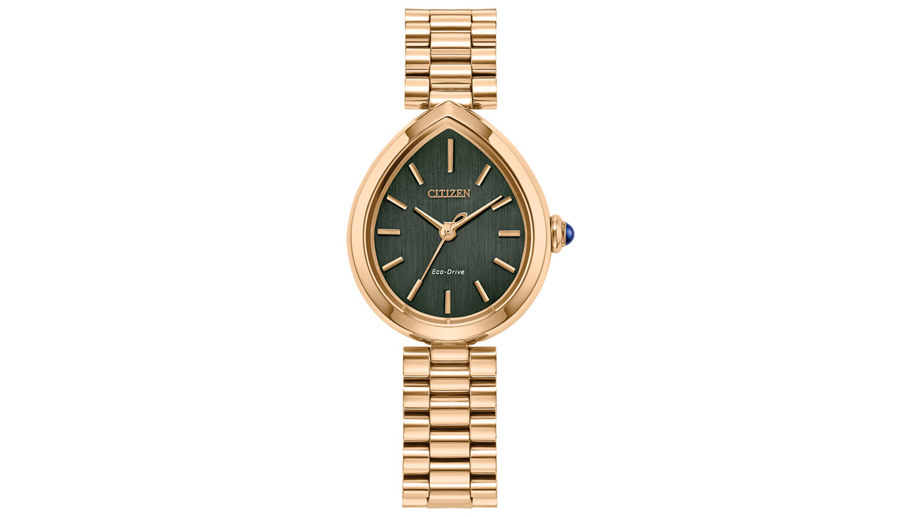 Citizen’s new “Rainell” women’s watch has a raindrop-shaped case and is available with a silver-, gold-, purple-, or green-colored dial.