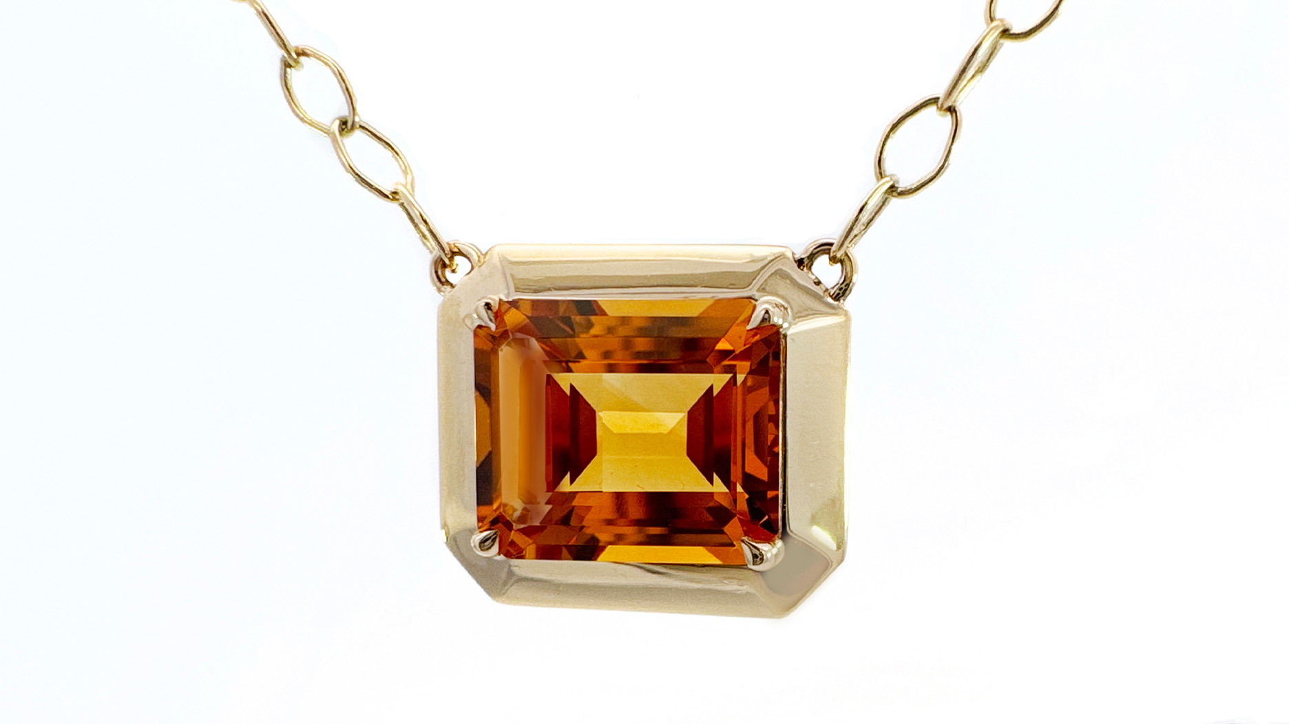 The 14-karat yellow gold necklace features a 6.73-carat emerald-cut citrine and was handcrafted in Greenwich St. Jeweler’s New York City workshop. It is valued at $3,500.
