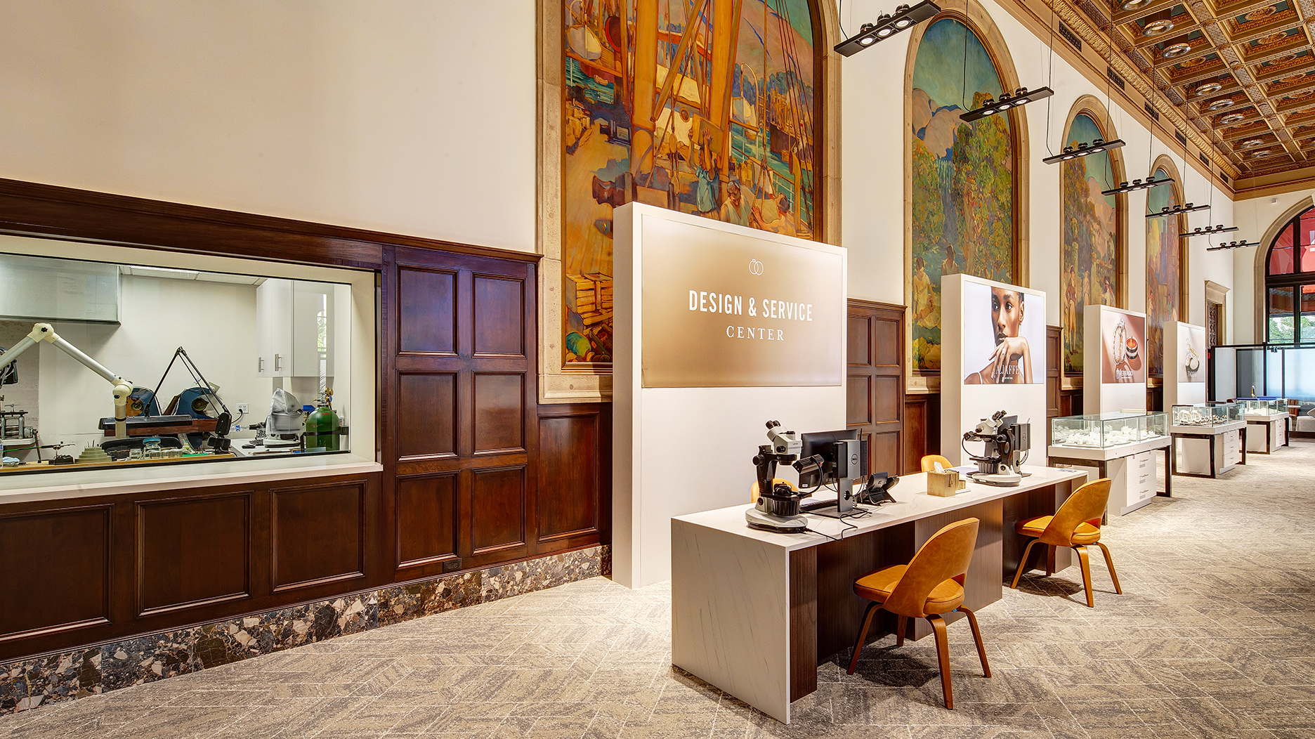 The showroom includes diamond viewing rooms, designer boutiques, a master jeweler for in-house repairs, customization, and cleaning, as well as a VIP hospitality lounge.