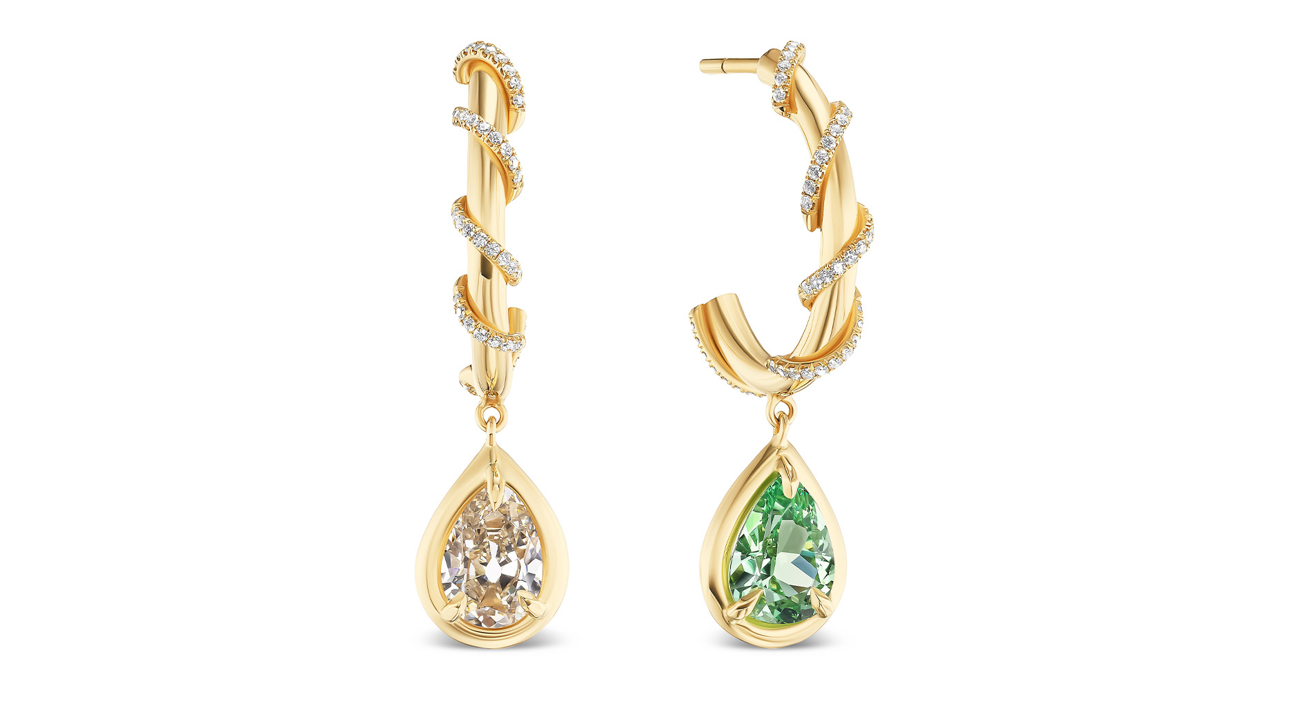 Fernández works with an array of colored gemstones, but she is currently using a lot of spessartite garnet, lavender spinel, Mahenge spinel, and more champagne and yellow-toned diamonds.