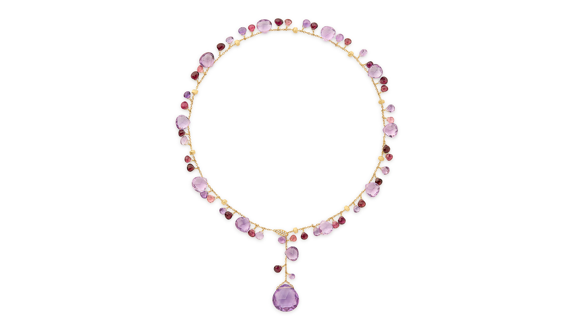 The “Paradise Amethyst” collection focuses on amethyst, pink tourmaline, garnet, and 18-karat yellow gold beads.