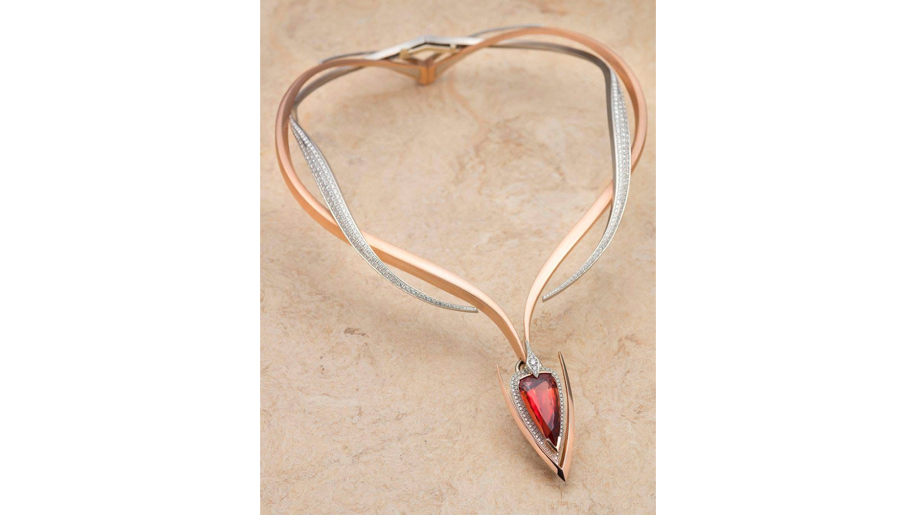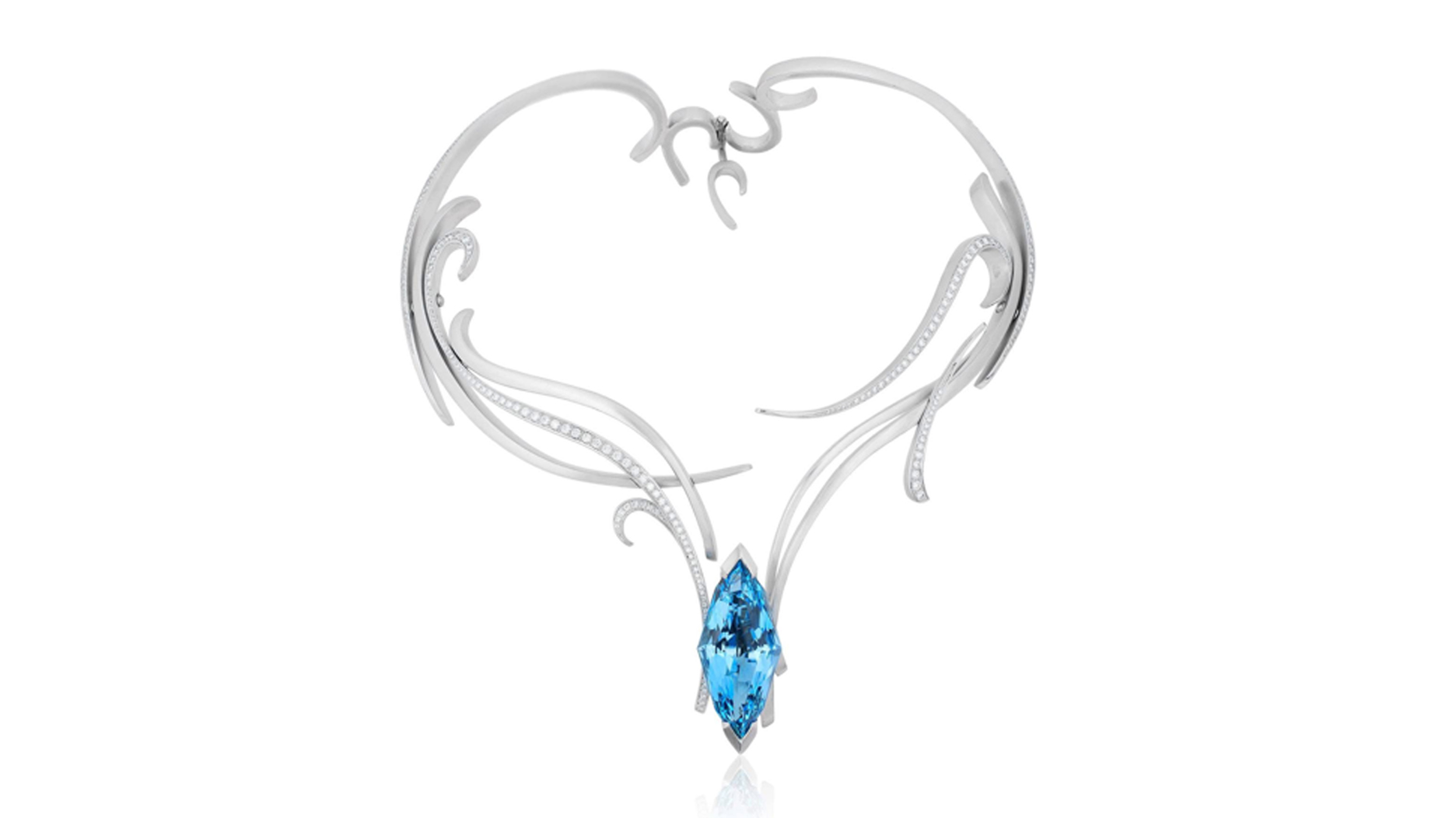 In 2017, Sakamoto’s “Dancing Waves” collar necklace, which features a pound of platinum and a 57-carat aquamarine, won the AGTA Spectrum Award for “Best Use of Platinum and Color” and took first place in the “Evening Wear” category.