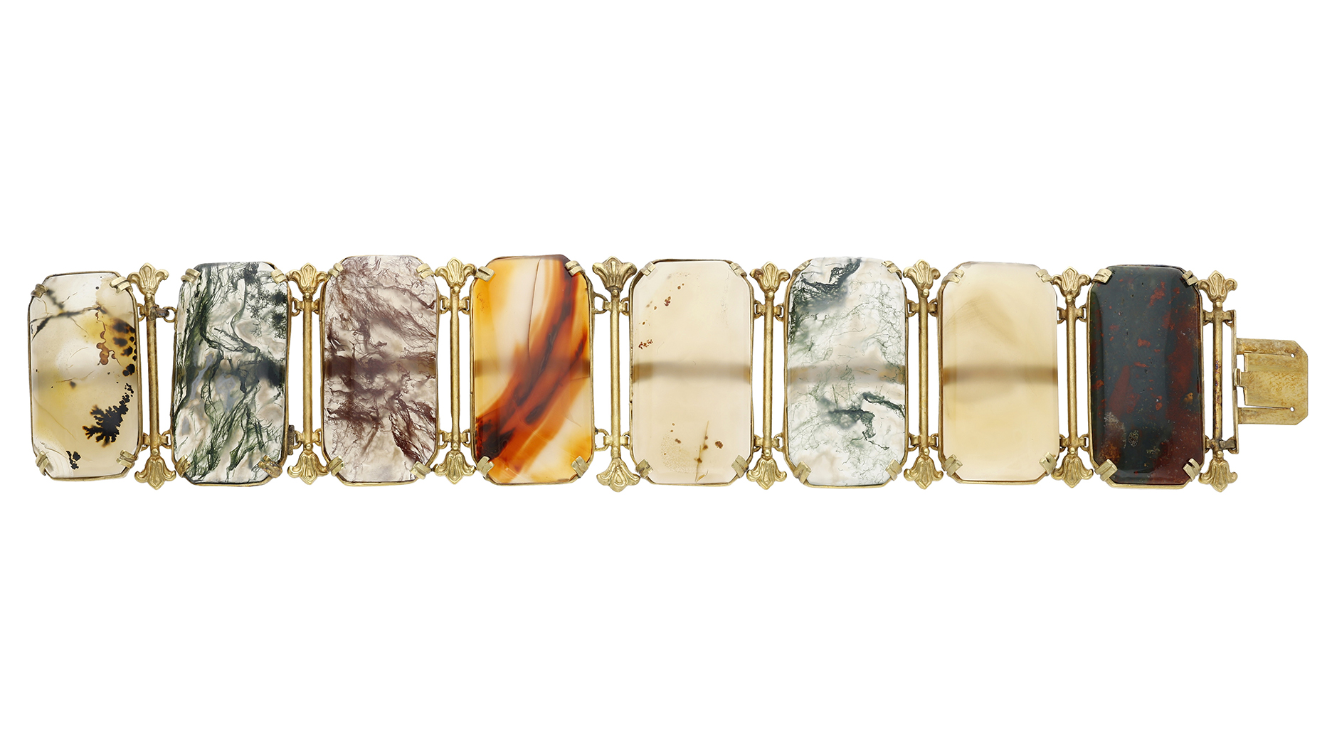 A Georgian gold and agate bracelet, featuring eight rectangular agate panels, each claw set with baton-links between, is estimated to sell for £3,000 to £5,000 ($4,000 to $6,700).