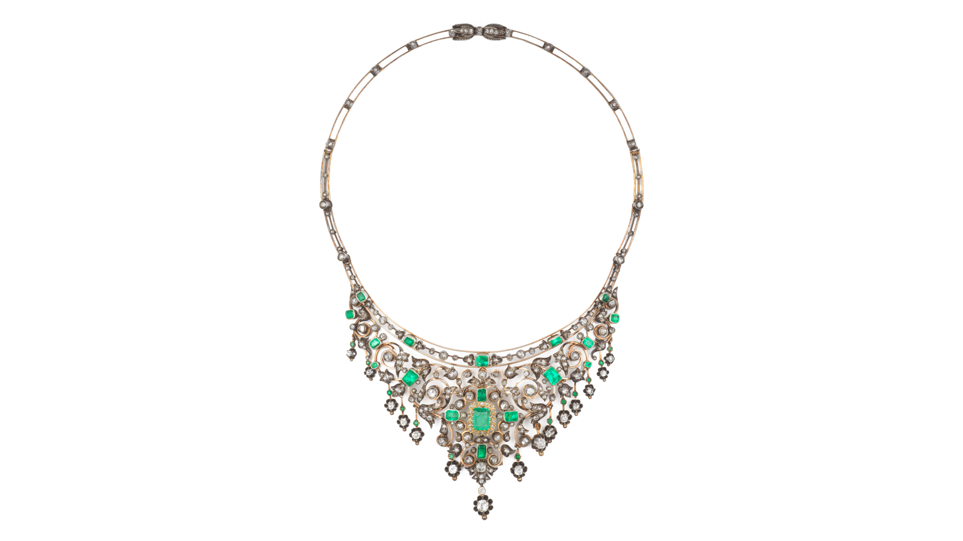 There is also an emerald and diamond necklace dating from the end of the 19th century. Originating from a Greek princess, it features an openwork mount with foliate scrolling motifs set with diamonds and highlighted by step-cut emeralds, which suspending emeralds and old brilliant-cut diamond drops.