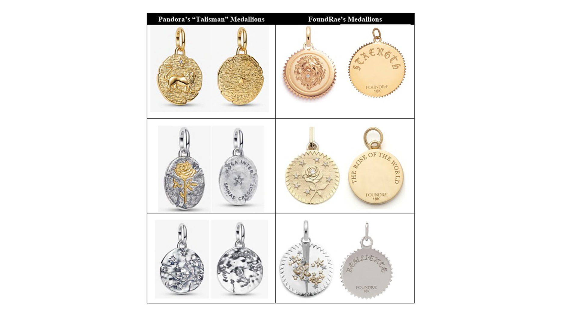 This collection is “so similar in look and feel to FoundRae’s signature pieces, and the marketing tactics promoting the collection so reminiscent of FoundRae’s aesthetic, that FoundRae found itself fielding inquiries from customers pointing out the similarities between Pandora’s Talisman collection and FoundRae’s medallions,” Foundrae stated in court documents.