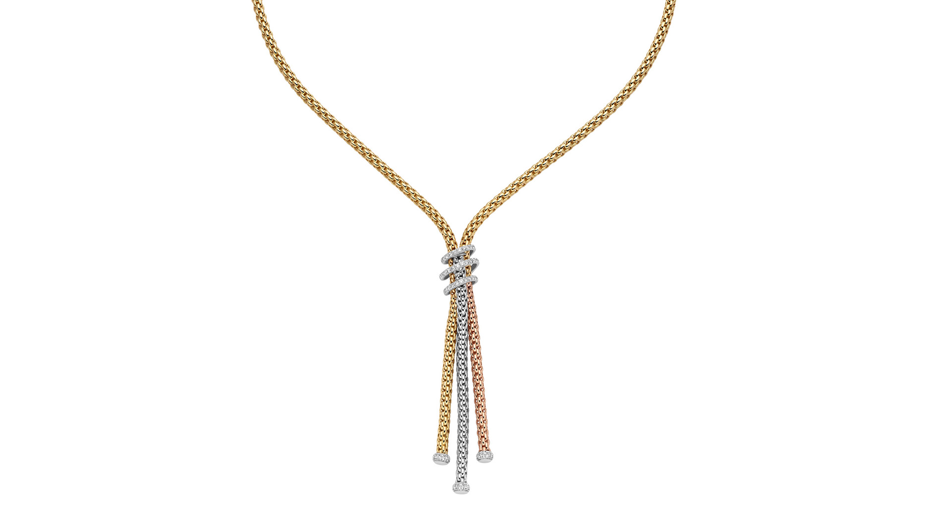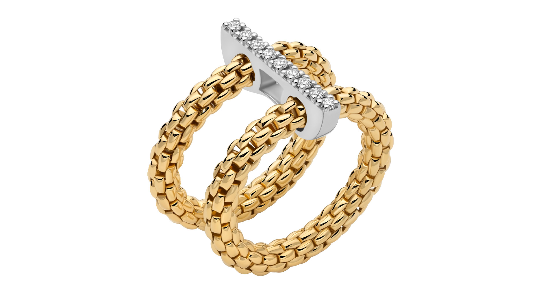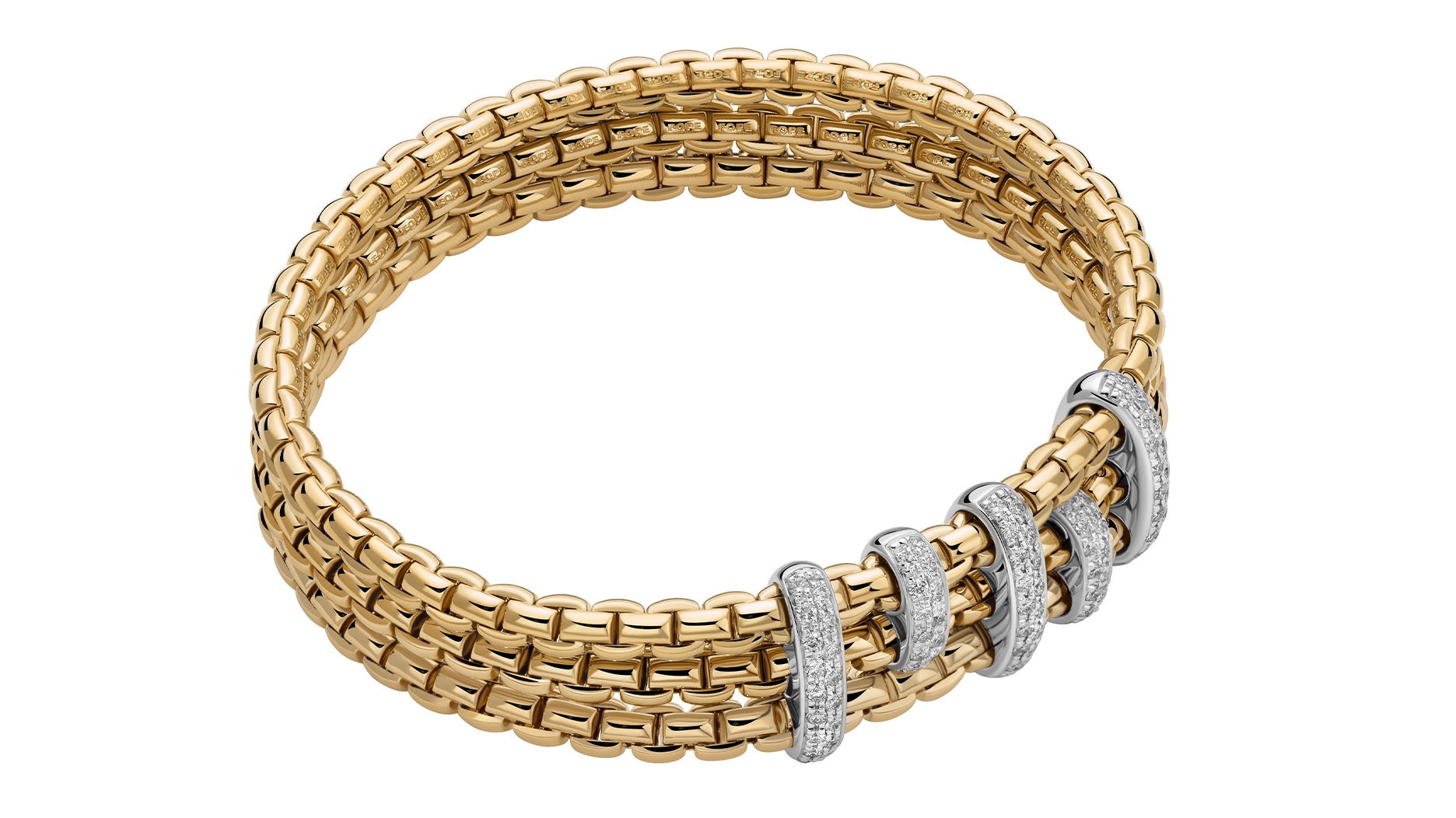 Fope is known for its patented “Flex’it” system that uses microscopic 18-karat gold springs inserted in its mesh design of weaved gold to make the jewelry elastic and flexible.