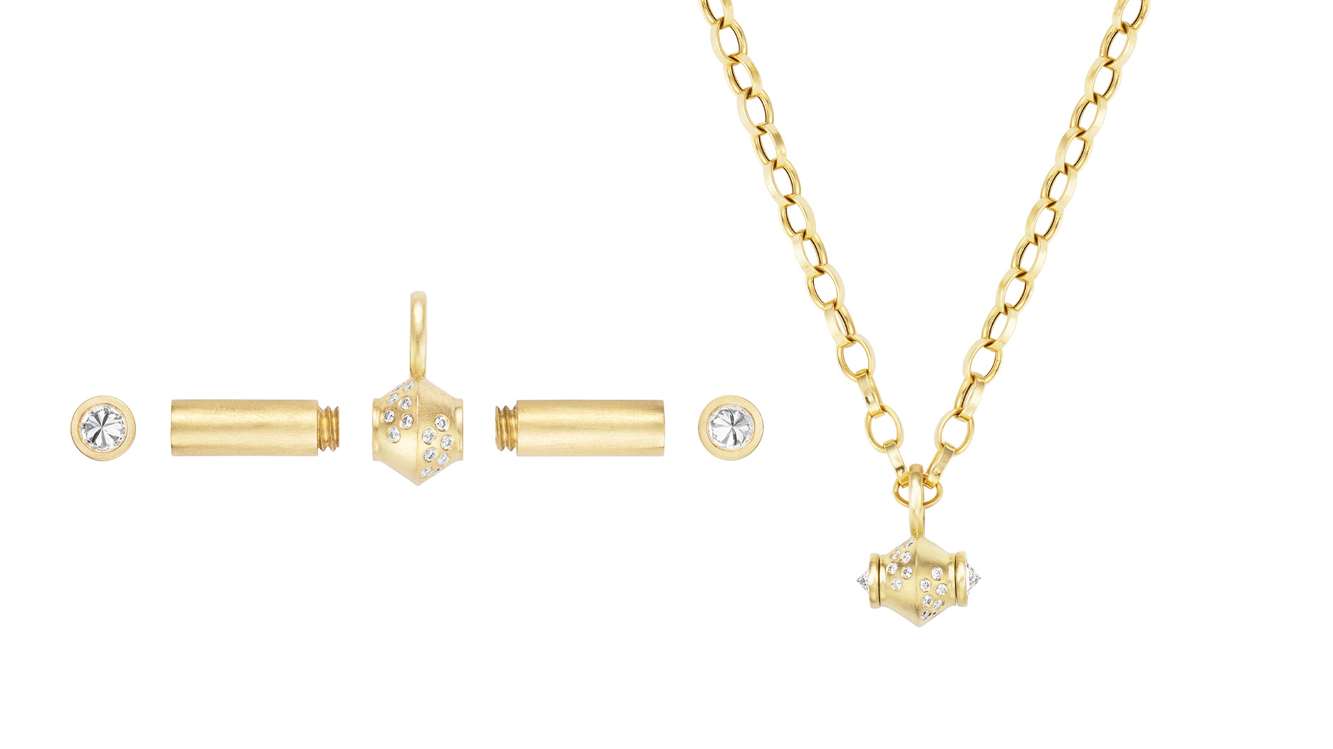 The toggle pendant has a modular construction where the inverted diamond-set ends and the brushed gold tubes unscrew from the center, allowing the piece to be worn in multiple ways.