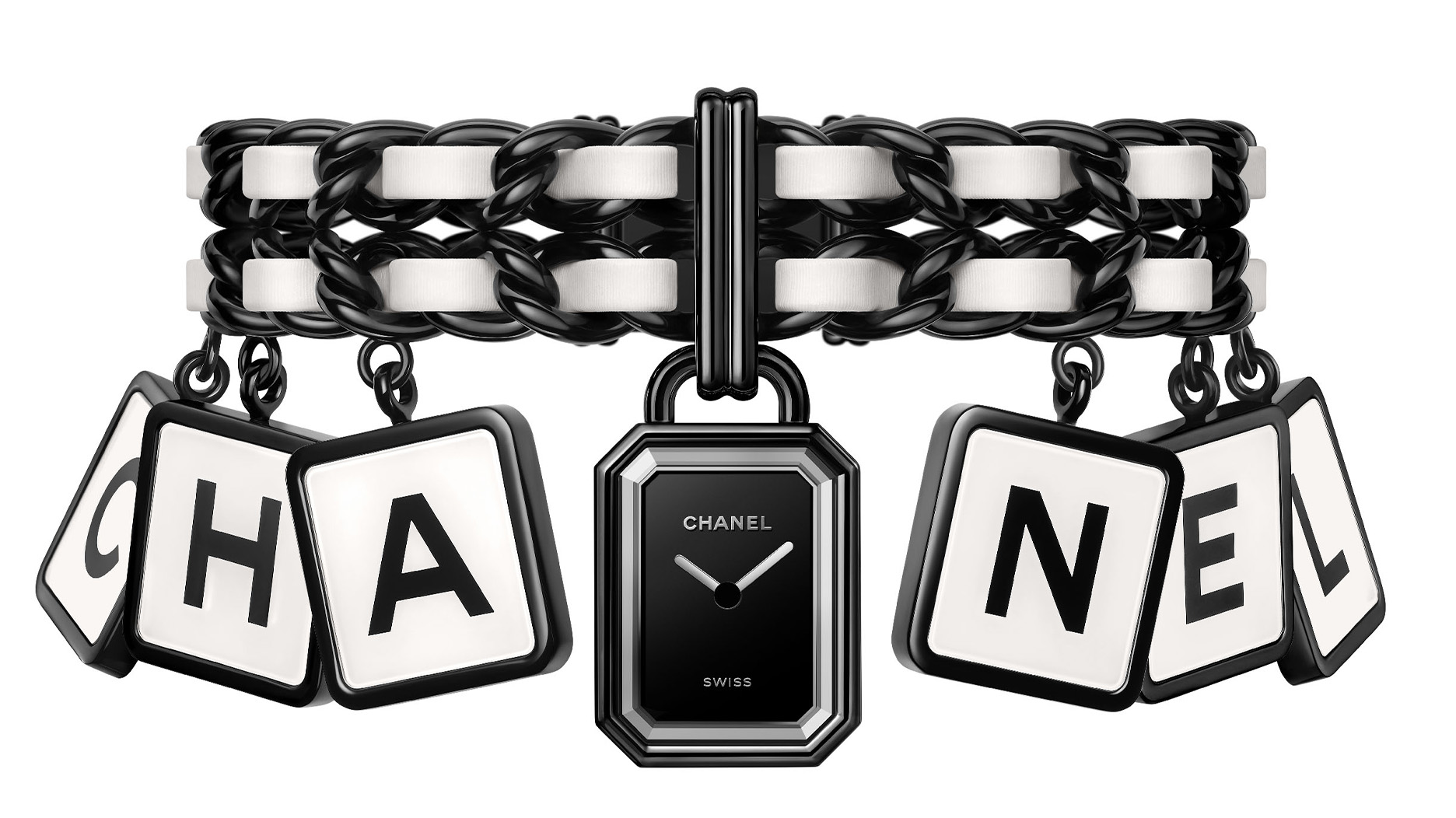 These black-coated steel and white lacquer charms spell out “Chanel” with the watch at the center.
