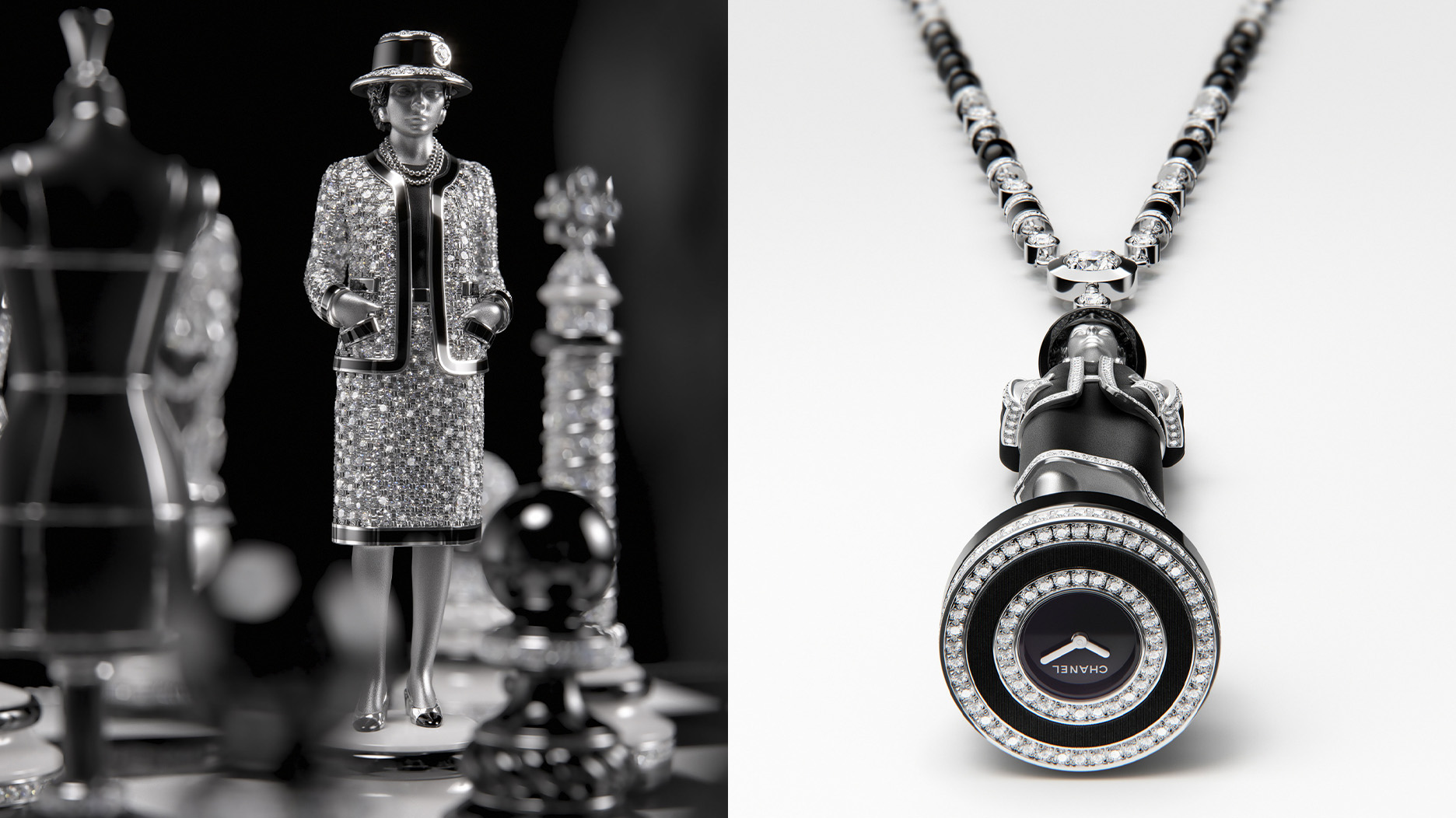 She is crafted from 18-karat white gold, wearing her tweed suit adorned with 731 brilliant-cut diamonds and black-lacquered trim, her hat, and slingback heels.