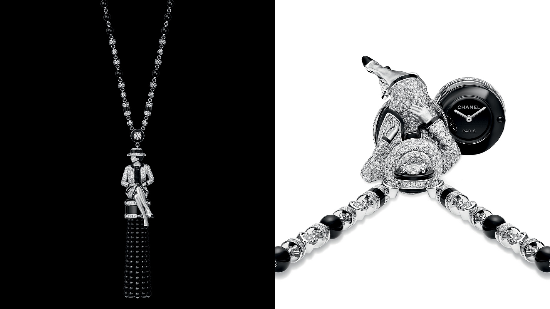 She sits on a pompon of 256 onyx beads that slides to the side, revealing the watch dial with a black-lacquered bezel.