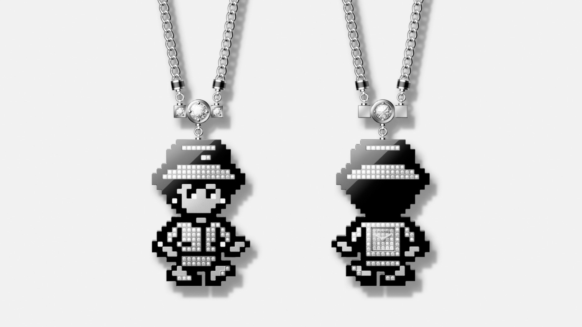 The “Coco Game” long necklace takes the sculptural interpretation of Coco Chanel and brings it into the world of a video game.