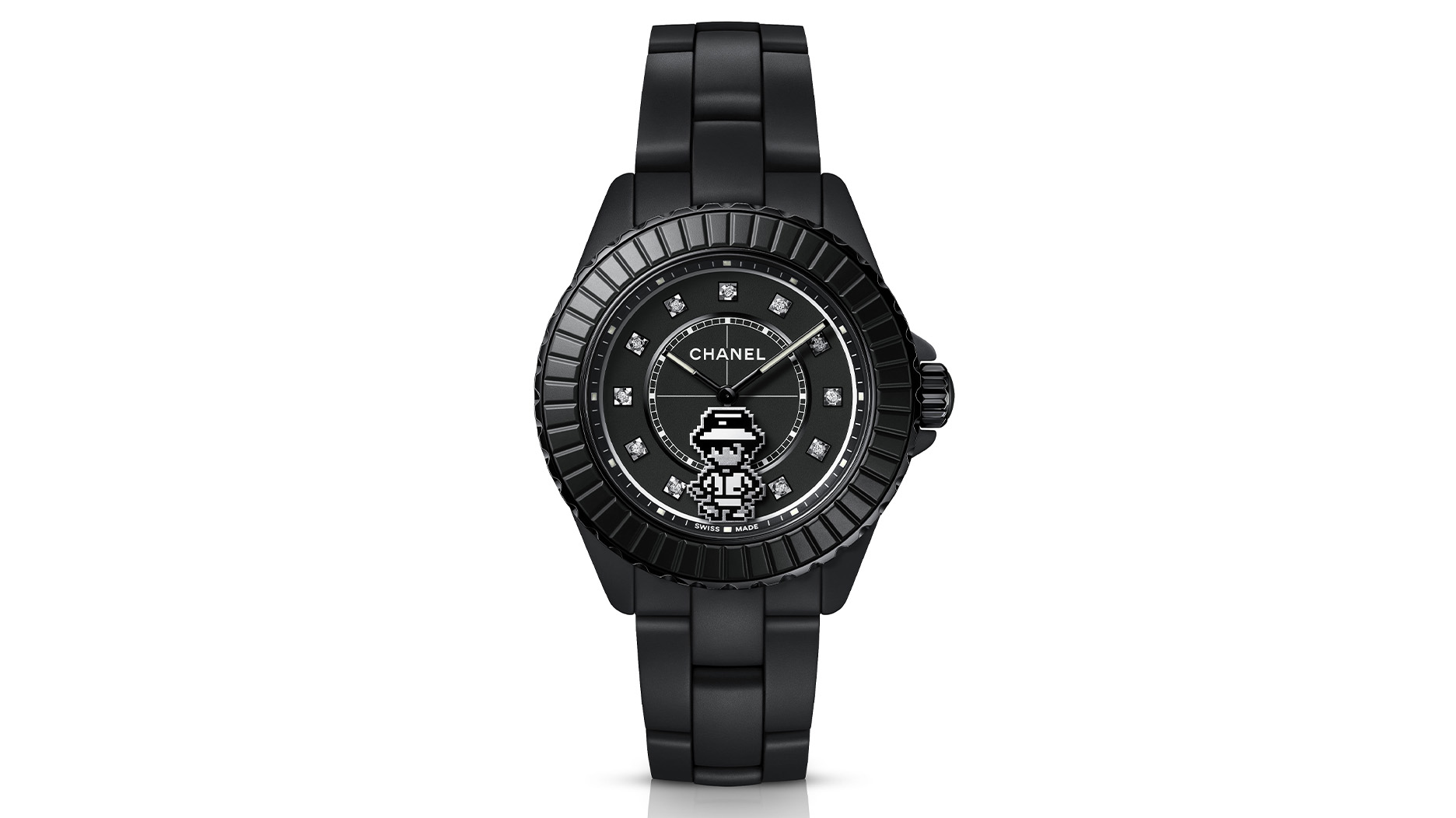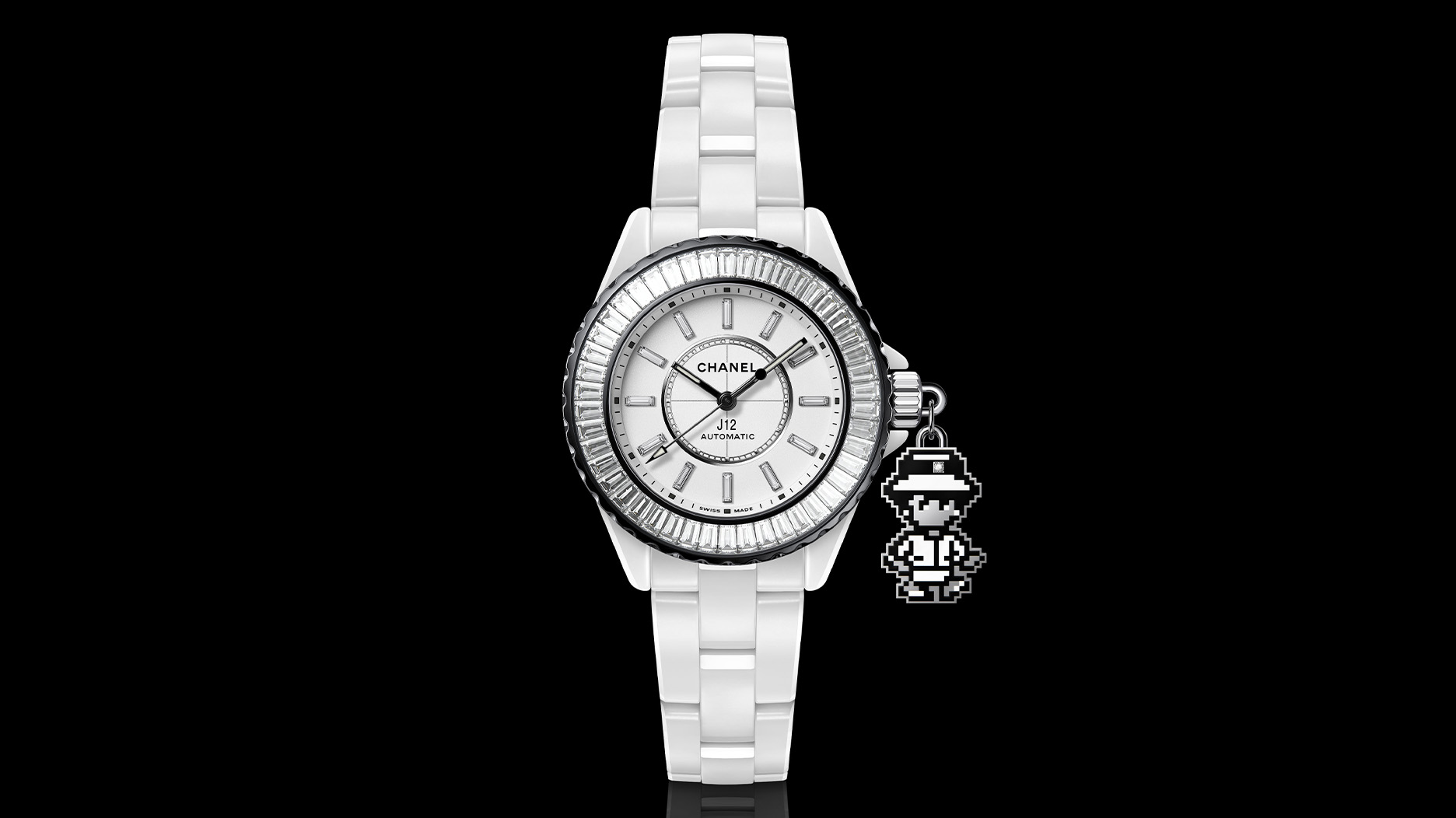 The “J12 Coco Game Charms” watch takes the pixelated character of Coco Chanel and features her as a charm dangling on the side of the matte white ceramic crown.