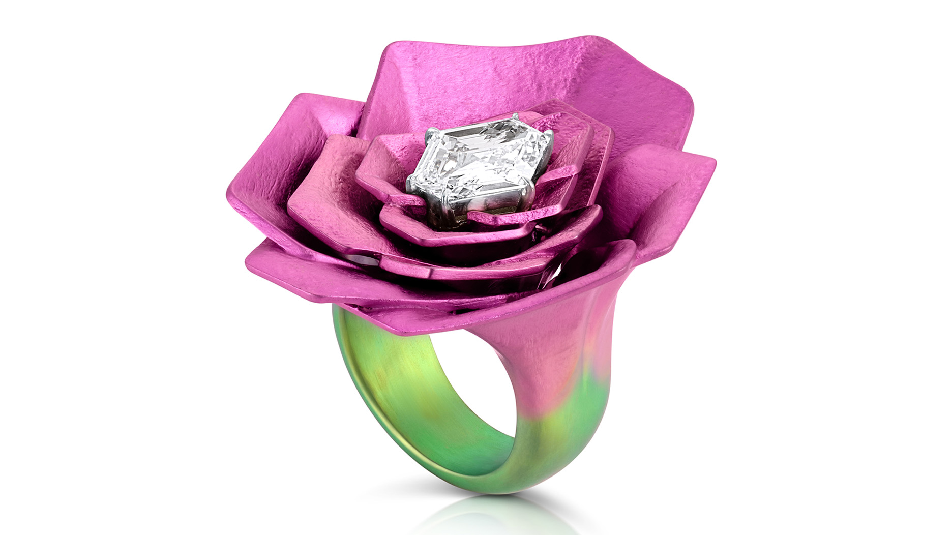 Titanium is the material that ties the collection together as it has been anodized in shades from dusty rose bronze to ombrés of blue, violet, pink, and green to evoke the hues from Neeley’s dreams.