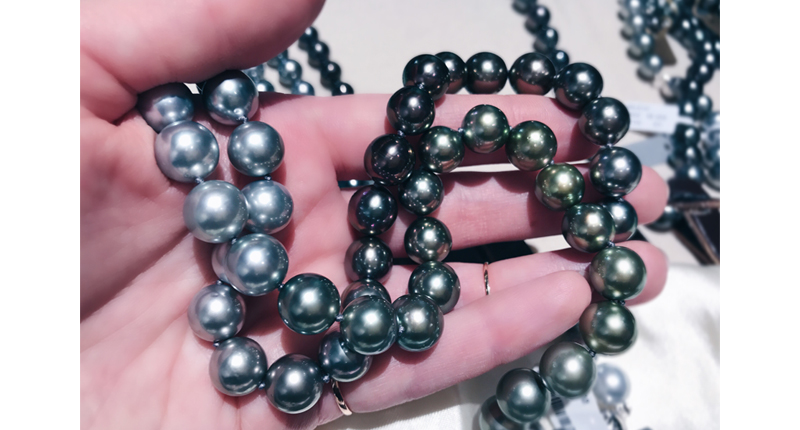 Mastoloni’s team told me that long, multi-colored pearl strands are doing very well at the moment. People are responding to gradiated, ombre necklaces combining black, gray, silver and white pearls. A woman who has a classic strand of white or black Tahitian pearls and loves the look of them now wants a piece of pearl jewelry that is just as classic, but different from what she owns.