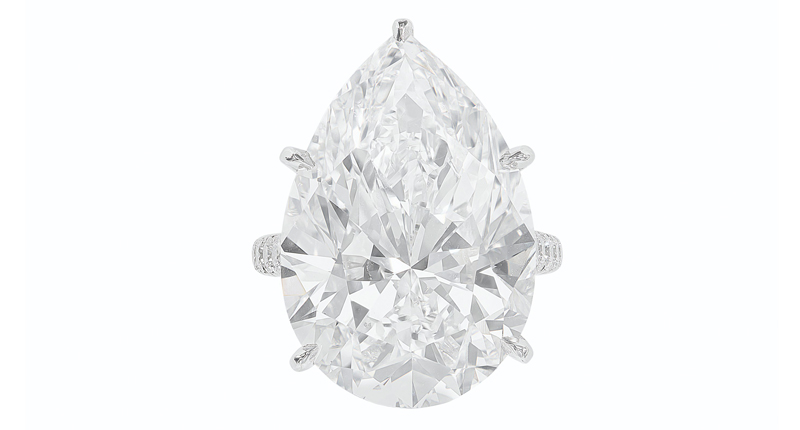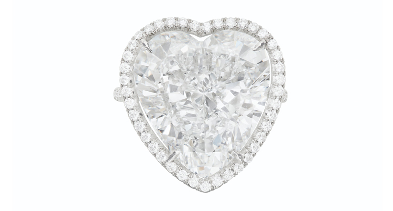 Other white diamonds of particular import are the above ring with a 25.22-carat, VVS2, D color, pear-shaped diamond valued at $1.5 million to $2.5 million, and the below ring with 15.20-carat heart modified brilliant-cut diamond.