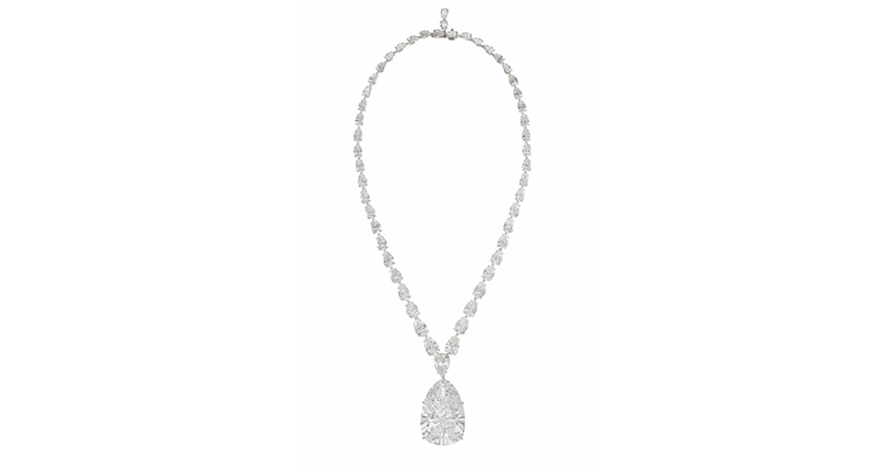 There they can spy the lot leading the Magnificent Jewels sale—a diamond necklace, pictured at top of article and above, featuring a 115.83-carat, F color, VVS1 pear-shaped diamond, valued at $5 million to $7 million.