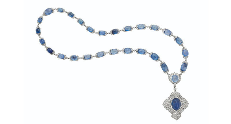 Leading the colored gemstone lots are a ring with 42.45-carat Burmese sapphire ($350,000-$550,000), a 35.77-carat Colombian emerald ring ($300,000-$500,000), and the below Art Deco sapphire and diamond sautoir by Bulgari ($650,000-$850,000).
