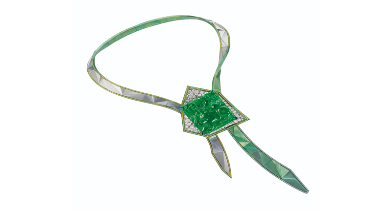 The necklace (rendering pictured below) features a detachable brooch set with jadeite plaque and resembles French architect Jean Nouvel’s 53 West 53 building in New York City.