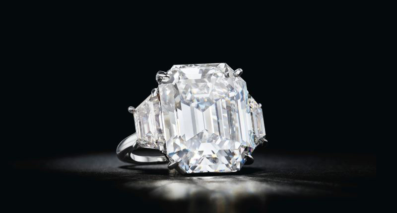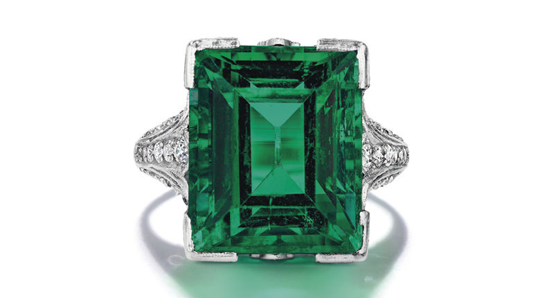 The jewel (seen at top) was offered by the Virginia Museum of Fine Arts, along with “The duPont Emerald” featuring a no clarity enhancement, modified rectangular step-cut 9.11-carat stone. Set in a Tiffany & Co. ring, the piece earned $1.6 million, more than three times its low estimate.